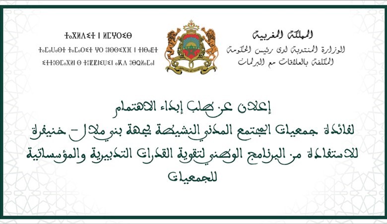 تعلن الوزارة المنتدبة لدى رئيس الحكومة المكلفة بالعلاقات مع البرلمان (مديرية العلاقات مع المجتمع المدني) عن فتح باب تقديم طلب إبداء الاهتمام لفائدة الجمعيات للاستفادة من البرنامج الوطني لدعم القدرات التنظيمية والمؤسساتية لجمعيات المجتمع المدني بجهة بني ملال خنيفرة.