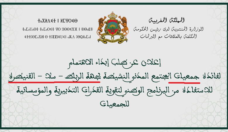 تعلن الوزارة المنتدبة لدى رئيس الحكومة المكلفة بالعلاقات مع البرلمان (مديرية العلاقات مع المجتمع المدني) عن فتح باب تقديم طلب إبداء الاهتمام لفائدة الجمعيات للاستفادة من البرنامج الوطني لدعم القدرات التنظيمية والمؤسساتية لجمعيات المجتمع المدني بجهة الرباط سلا القنيطرة.